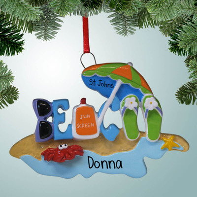 Personalized Beach with Bottle of Sunscreen Christmas Ornament