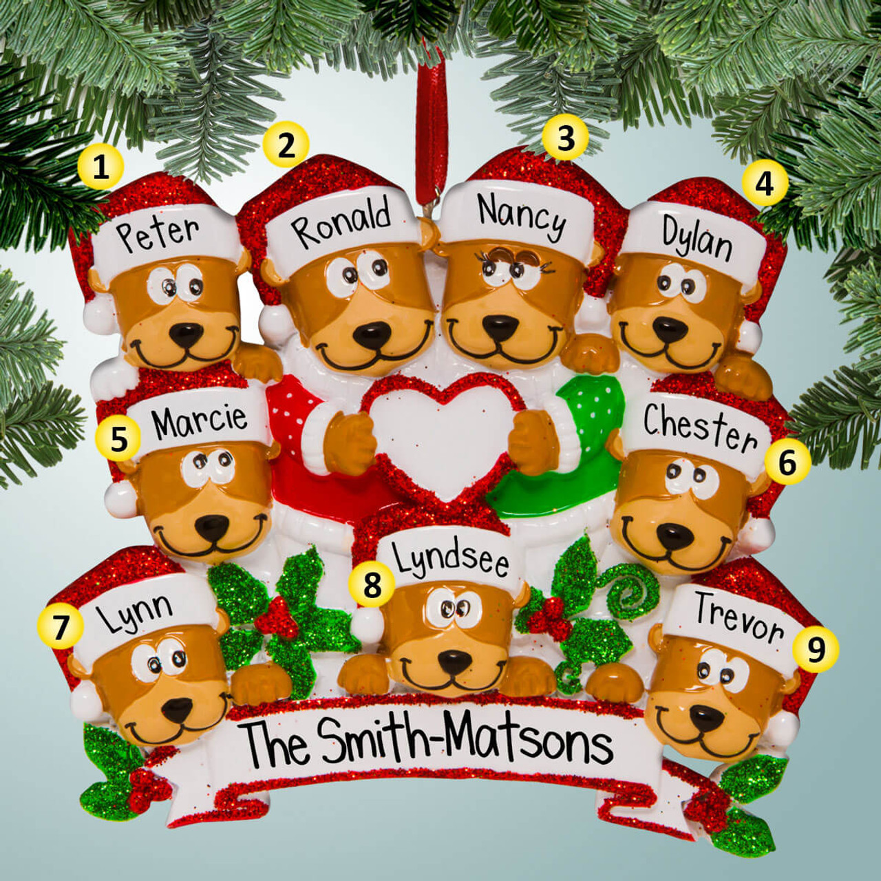 Brown Bear, Brown Bear, What do you See? I See a Large Family of Nine Looking at Me! If you have a gigantic family that is just snapping out of a long winter's nap, then this personalized Christmas ornament is the perfect choice for you and the rest of your growlers!