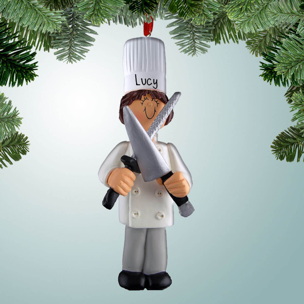 Personalized Chef with Big Knife - Female with Brown Hair Christmas Ornament