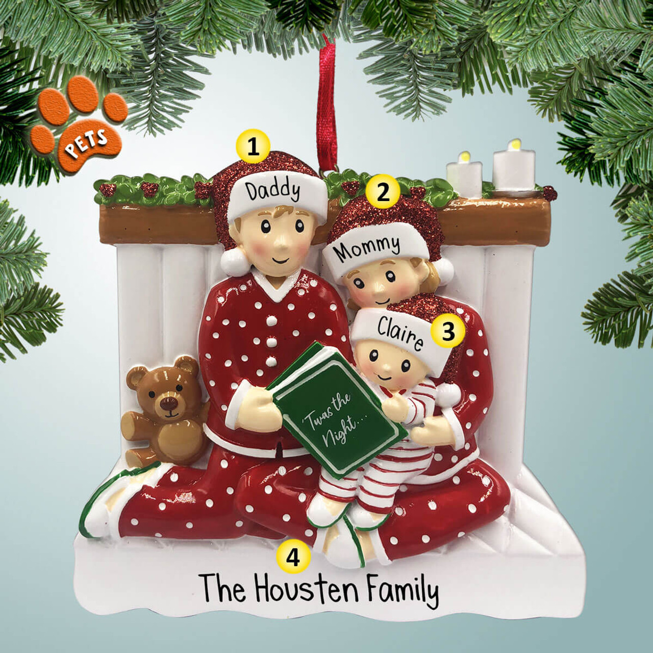 You can add up to 4 optional pets that we will arrange on the ornament. Anything from the "On Bottom" field, may get left off if there are too many pets. This ornament is for a Family of 3 only.