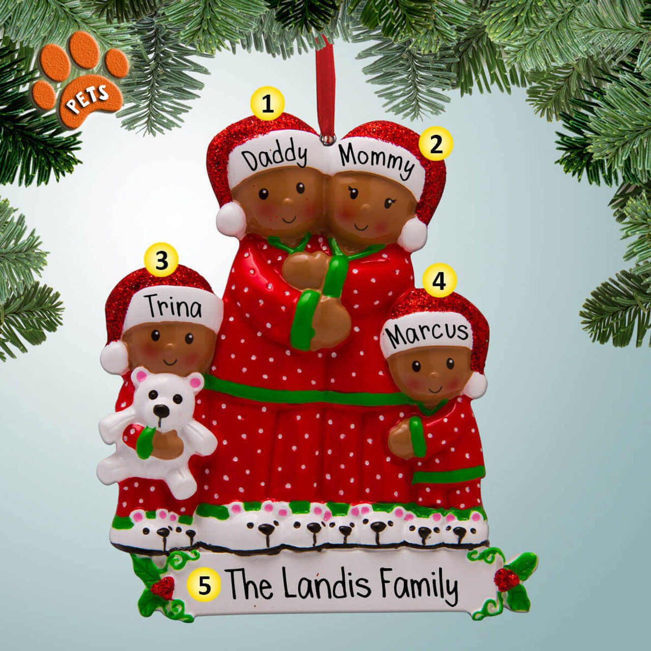 Personalized Christmas Family in Red Pajamas African American - 4 Christmas Ornament