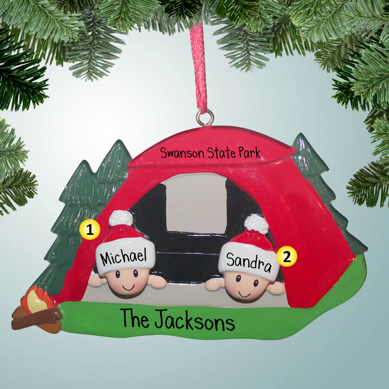 Let's hit the campground! Is there anything more enjoyable than sleeping out in the wilderness under the stars with your significant other? If you can't stand bugs, spiders, and dirt, we're quite certain you can think of several things that are better! This personalized camping ornament is perfect for the adventurous couple!