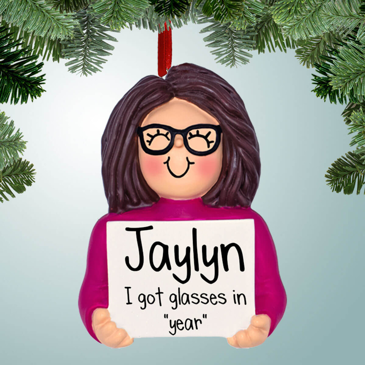 Personalized Eyeglasses Girl with Brown Hair Christmas Ornament