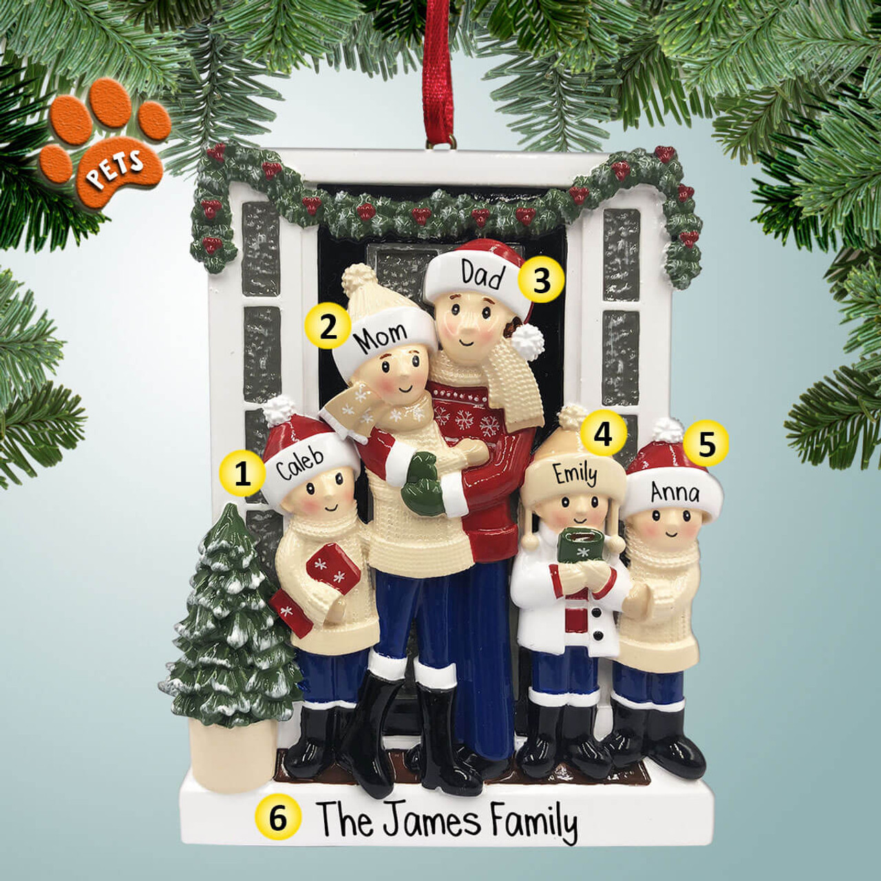 You can add up to 4 optional pets that we will arrange on the ornament. Anything from the "On Bottom" field, may get left off if there are too many pets. This ornament is for a Family of 5 only.