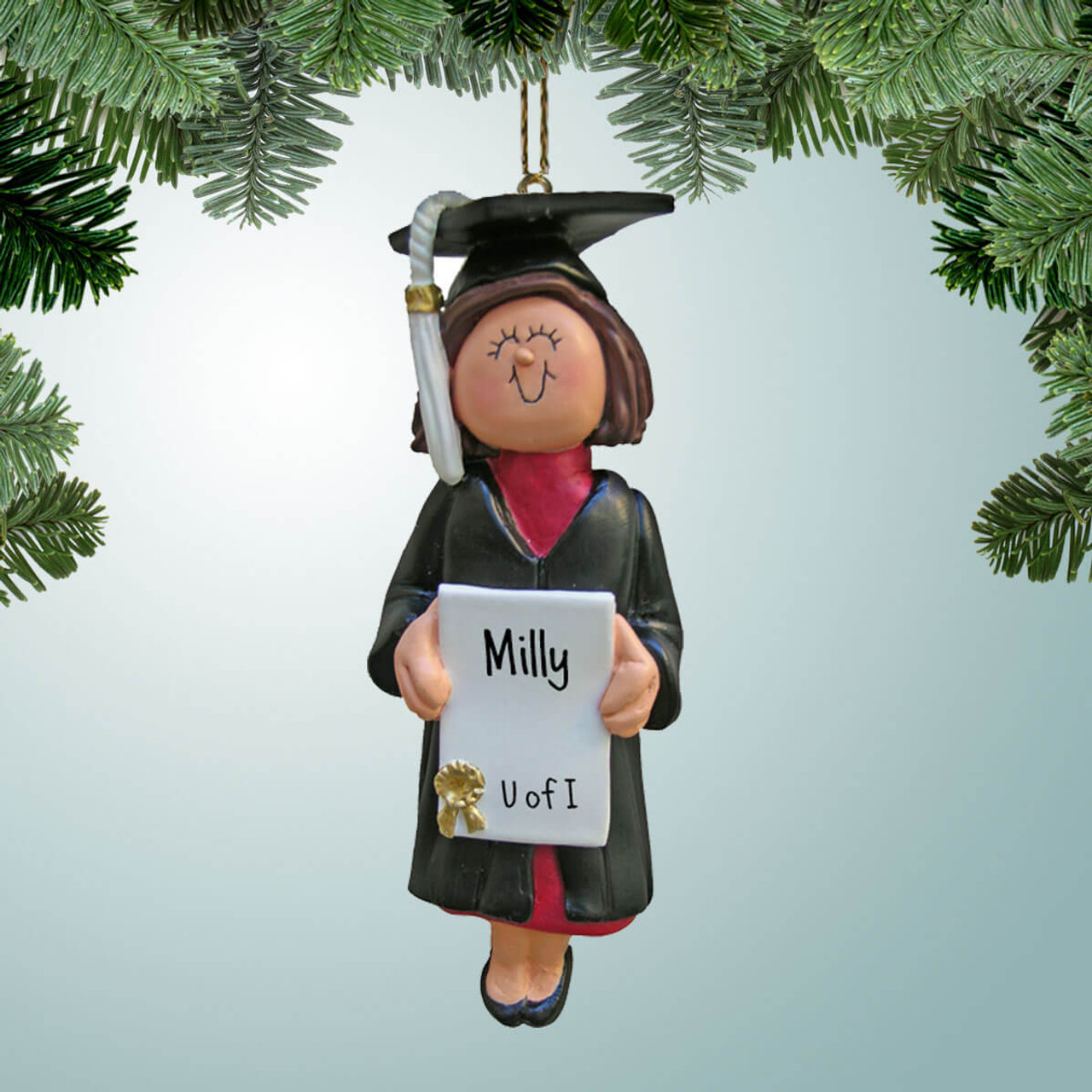 Personalized Graduate Girl Ribbon on Diploma - Brown Hair Christmas Ornament