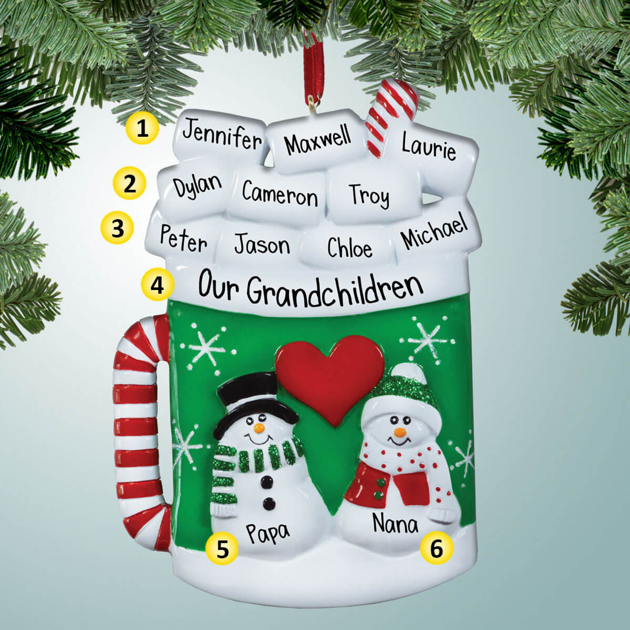 There is so much love in this personalized Christmas ornament that all of these marshmallows are about to melt into the hot chocolate! There are lots of options with this ornament. It's a great idea for grandparents with all their grandchildren, or simply for a large family! Whatever the case, it will be the tastiest ornament on your tree!