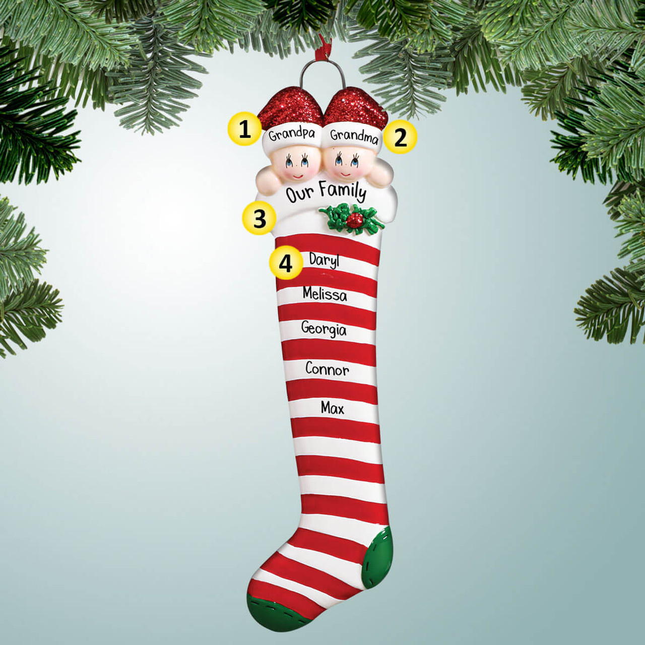 For the stocking section, please separate each name with a comma. We will start by writing each name on the white lines first, then the red. If certain names need to be grouped together, please be specific in the Special Instructions box.
