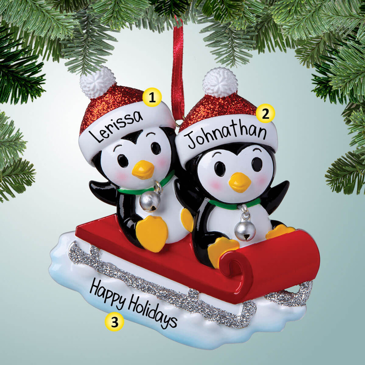 Are penguins now using sleds to slide down the hill? They must have realized they look even cuter that way! Help this loveable couple by helping them find the fastest way possible to your Christmas tree! If you love penguins, then this personalize ornament is just what you're looking for!
