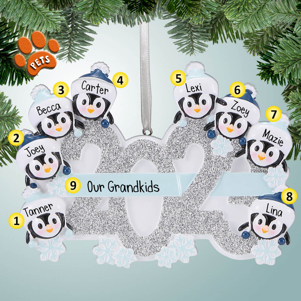 This large penguin family of eight is here to pave the way to the 2023 Christmas season! They may look like they prefer the cold, but your home will instantly warm their hearts! This personalized ornament is a great idea for grandchildren as well!