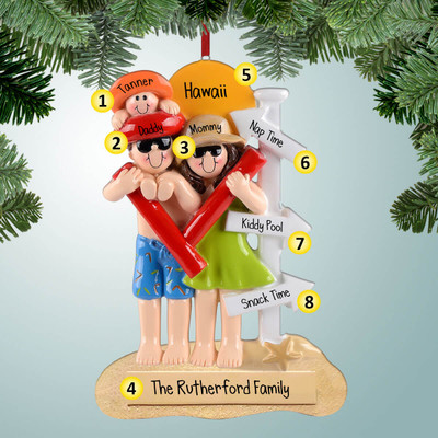 Which way is it to the beach? This family of three is looking to find the perfect spot to try out those brand new swim noodles, and their young one is going to make sure it happens! If your new family loves the summertime, then this is the perfect personalized ornament for you!