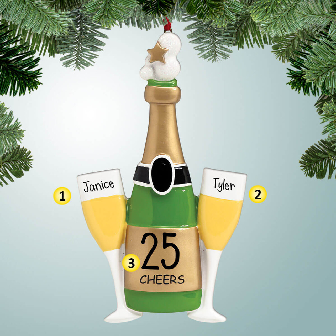 A champagne toast can be for any occasion. Weddings, anniversaries, birthdays, and even Christmas dinners! This ornament can be personalized for any occasion that you have. The word "Cheers" is already part of the ornament design and cannot be changed or removed.