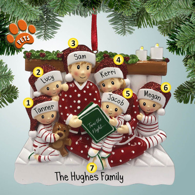 You can add up to 4 optional pets that we will arrange on the ornament. Anything from the "On Bottom" field, may get left off if there are too many pets. This ornament is for a Family of 6 only.