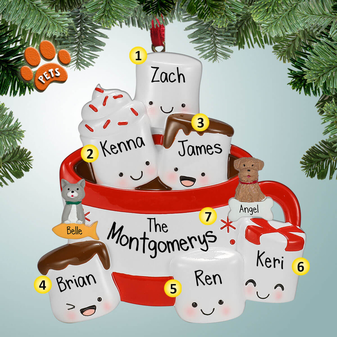 Imagine having a special Christmas ornament that shows your family of six enjoying hot chocolate together. Each family member is a marshmallow on that ornament! It would be a cute and unique decoration for your Christmas tree. It's a fun way to capture a cozy family moment during the holiday season. This personalized ornament would make your tree extra special and bring smiles to everyone's faces.