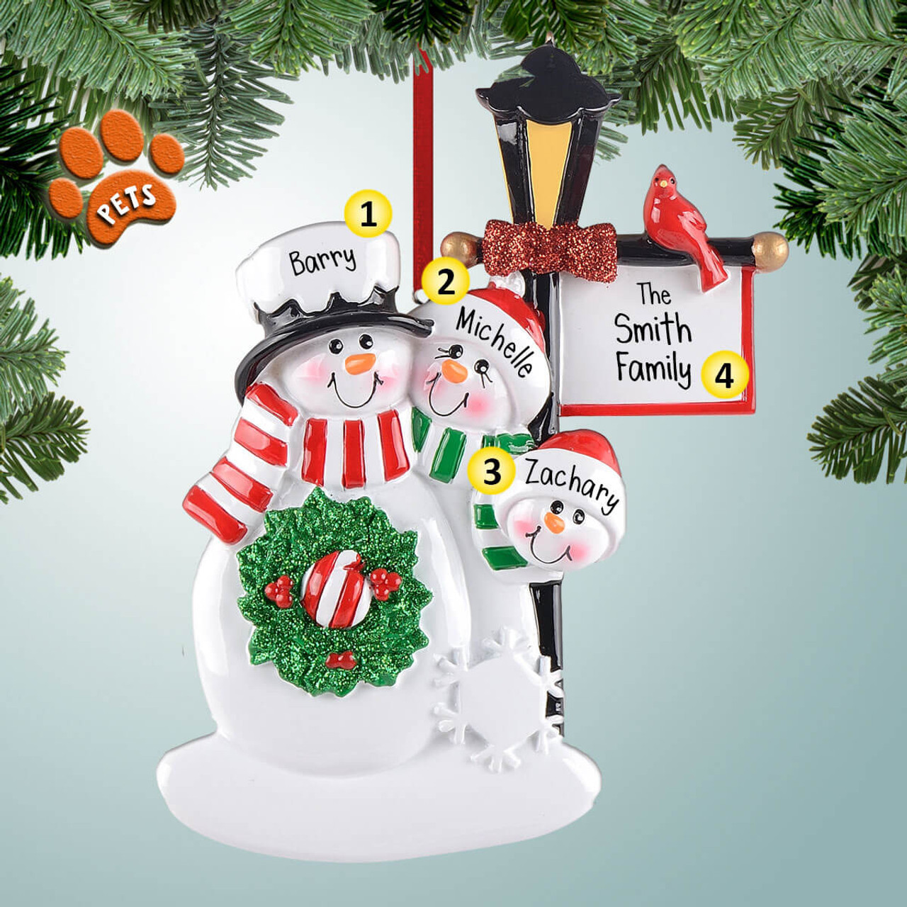 Personalized Snowman Family with Lamp Post Sign - 3 Christmas Ornament