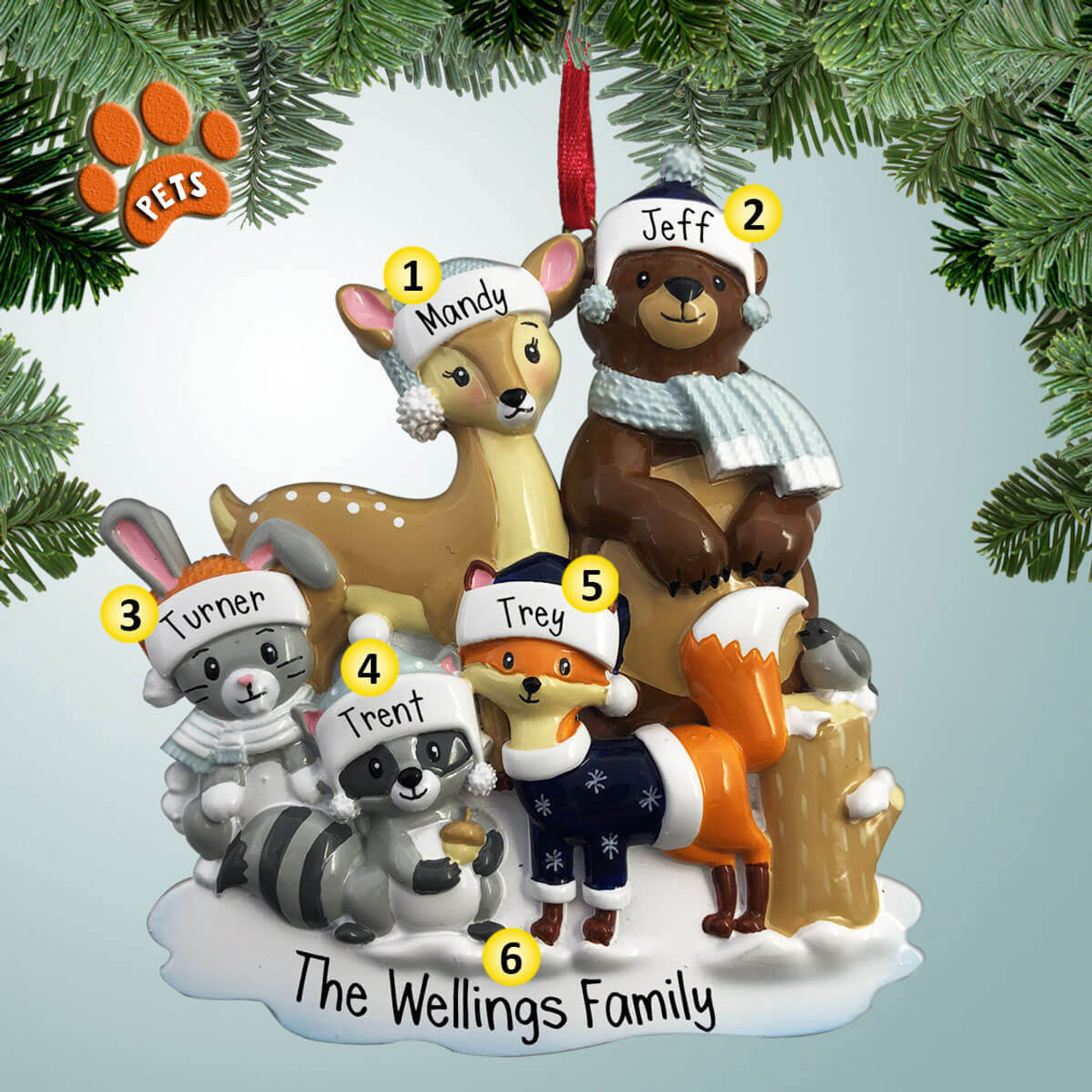 You have the option of adding up to 4 pets that we will arrange on the ornament. You do not have to add any pets. This ornament is for a Family of 5 only.