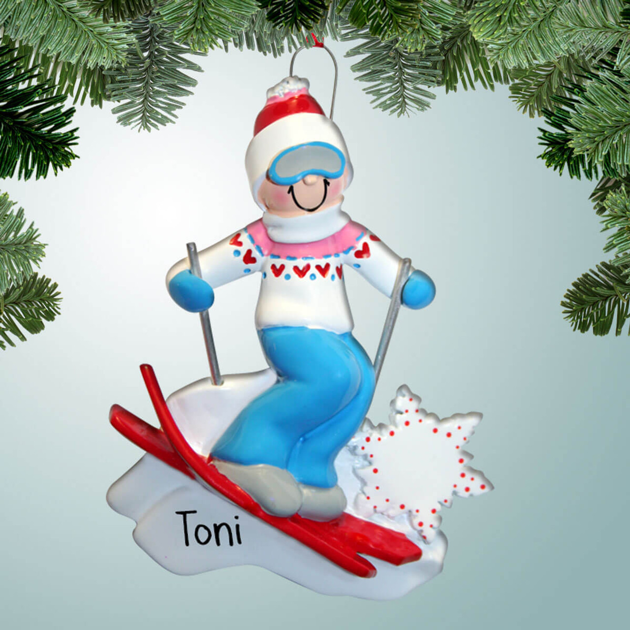 This skier is so confident that the smile on her face can be seen from the top of Mount Everest! If you've got a hot dog skier in your family, then this personalized Christmas ornament makes the perfect gift.