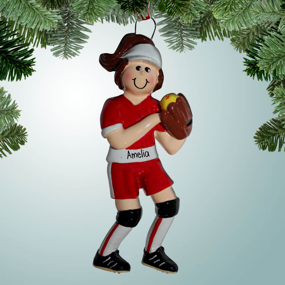 Personalized Softball Pitcher Red Uniform - Brown Hair Christmas Ornament