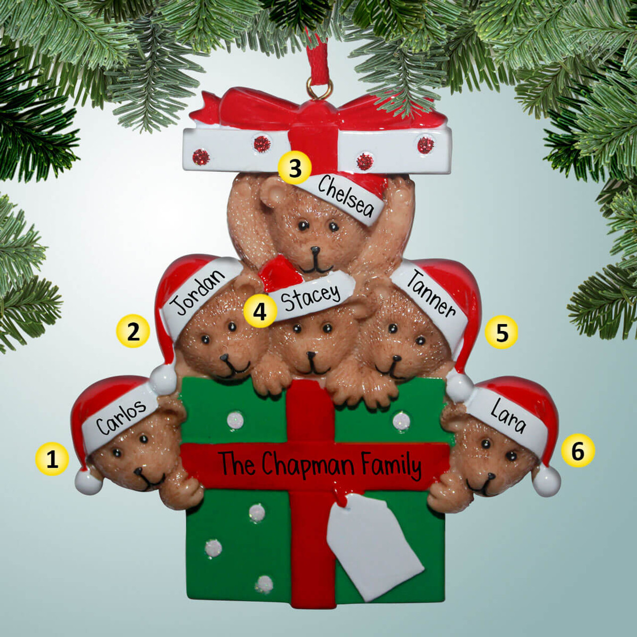 Personalized Teddy Bear Family with Large Present - 6 Christmas Ornament