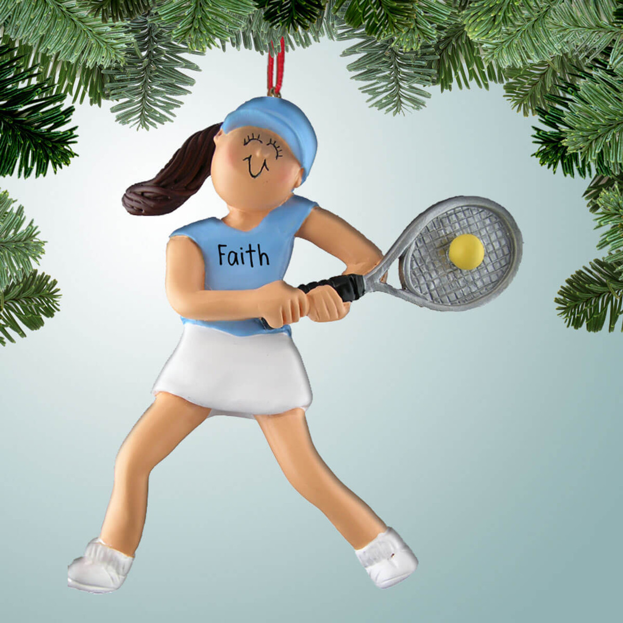 Personalized Tennis Girl with Blue Shirt - Brown Hair Christmas Ornament