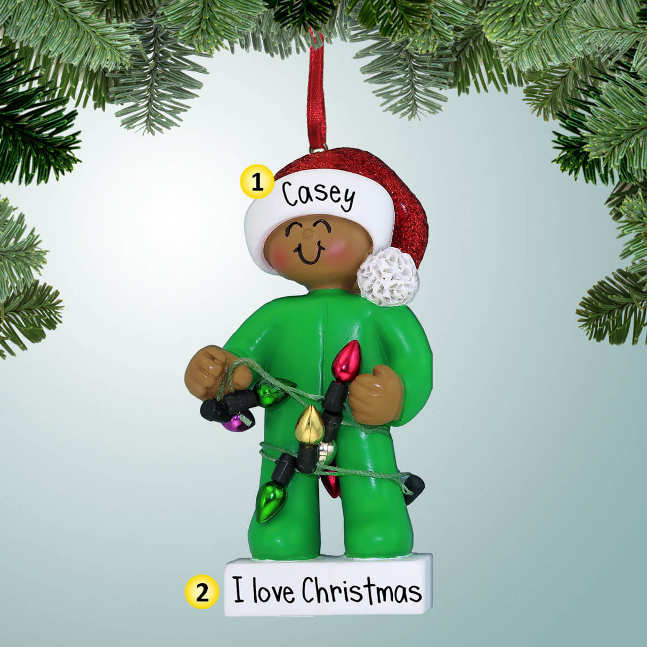 Personalized Young Child Wrapped in Lights - Dark Skin Christmas Ornament